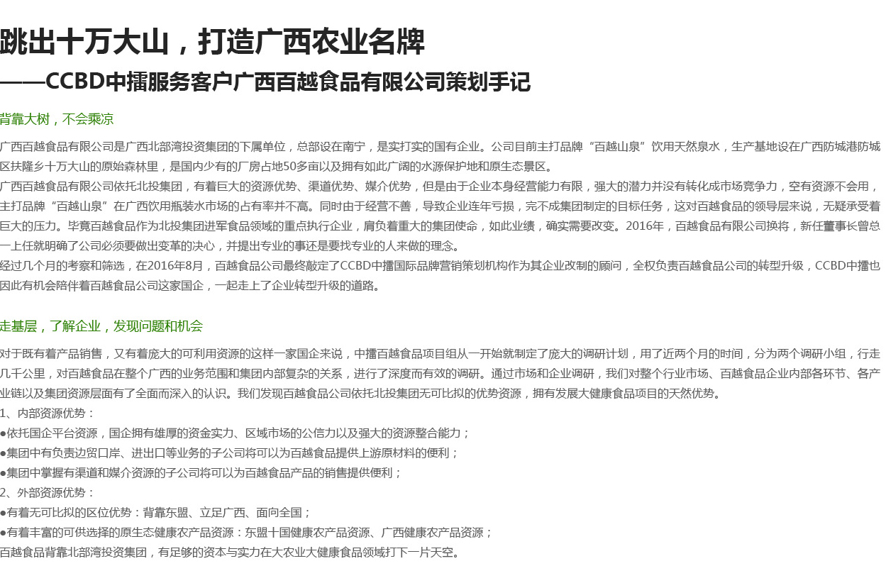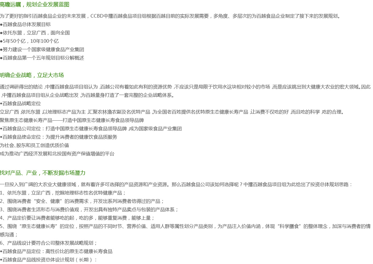 廣西百越食品有限公司依托北投集團,有著巨大的資源優(yōu)勢、渠道優(yōu)勢、媒介優(yōu)勢,但是由于企業(yè)本身經(jīng)營能力有限,強大的潛力并沒有轉(zhuǎn)化成市場競爭力,空有資源不會用,主打品...