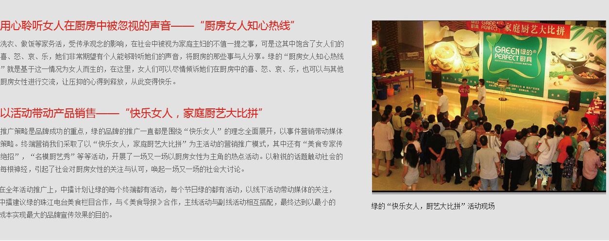 據(jù)調(diào)查了解,一個(gè)家庭主婦,每天約有四分之一的時(shí)間在廚房里度過,專職太太花費(fèi)的時(shí)間甚至更多,因此,中擂建議,綠的鍋具把關(guān)心女人廚房生活的質(zhì)量,女人們廚房的喜、怒、哀、樂作為自己的品牌使命,體現(xiàn)綠的承擔(dān)“關(guān)心女人”的責(zé)任,提高品牌形象。中擂通過對(duì)1000多名家庭主婦的調(diào)查了解后,從女人的角度出發(fā),發(fā)出的“體貼女人、理解女人”號(hào)召,做女人的知心朋友,學(xué)會(huì)聆聽她們的聲音。廚房的事依舊是雞毛蒜皮的事,可是綠的讓它變得不再無人問津,不再平淡如水。正是綠的,為女人著想,從理解、關(guān)心、愛護(hù)廚房中的女人角度出發(fā),提出“讓女人在廚房中快樂起來”的品牌核心主張,成功與國內(nèi)自主品牌甚至國際高端品牌區(qū)分開來。