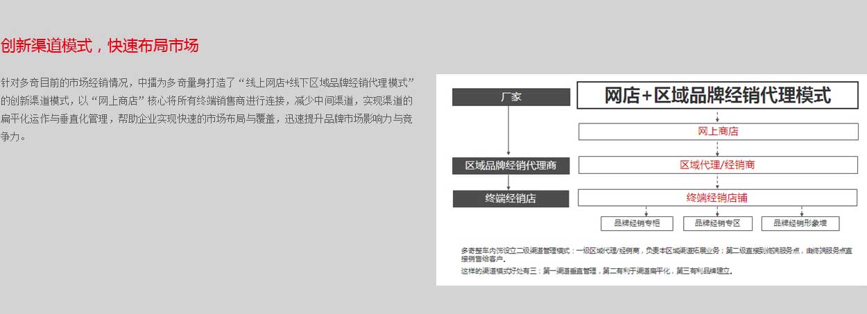 由于企業(yè)對(duì)渠道終端的管理及推廣不到位,導(dǎo)致多奇品牌終端產(chǎn)品陳列、形象展示較為混亂,嚴(yán)重制約了產(chǎn)品的銷售與推廣,針對(duì)多奇終端的情況,中擂為多奇提供了專柜設(shè)計(jì)改造、產(chǎn)品優(yōu)化陳列、終端價(jià)格維護(hù)、終端廣告宣傳、產(chǎn)品包裝設(shè)計(jì)、終端導(dǎo)購培訓(xùn)、終端網(wǎng)銷結(jié)合、終端促銷/活動(dòng)策劃八大終端改造服務(wù),實(shí)現(xiàn)多奇品牌終端的活化,快速提升終端的品牌形象及銷售力。