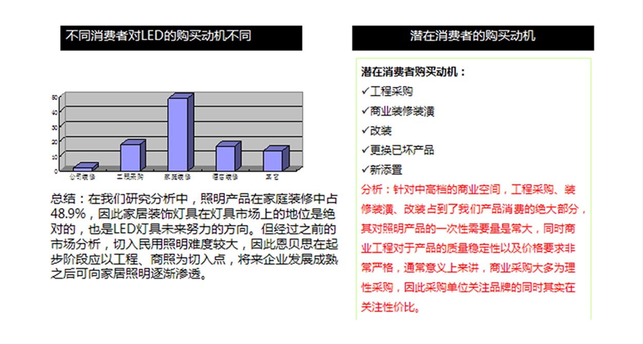 目前LED行業(yè)發(fā)展形勢大好,恩貝思以何種方式切入照明市場?商用LED照明市場發(fā)展較民用市場發(fā)展要好得多,加之政府扶持,恩貝思如何把握各種有利因素發(fā)展自身?在同行LED品牌日益同質(zhì)化的情況下,恩貝思應該采用怎樣的品牌概念和產(chǎn)品概念,以達到強化企業(yè)的整體競爭力、強化企業(yè)的技術性優(yōu)勢?