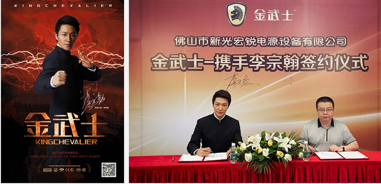 在CCBD中擂的協(xié)助下,2013年6月21日,新光宏銳電源設(shè)備有限公司金武士品牌正式簽約中國知名男演員、湖南衛(wèi)視熱播劇《百萬新娘之愛無悔》男一號王紹華扮演者李宗翰先生作為金武士品牌形象代言人,成為UPS行業(yè)第一個邀請明星作為形象代言的品牌。通過系列的宣傳推廣,極大地提升了金武士品牌的市場知名度與美譽度。