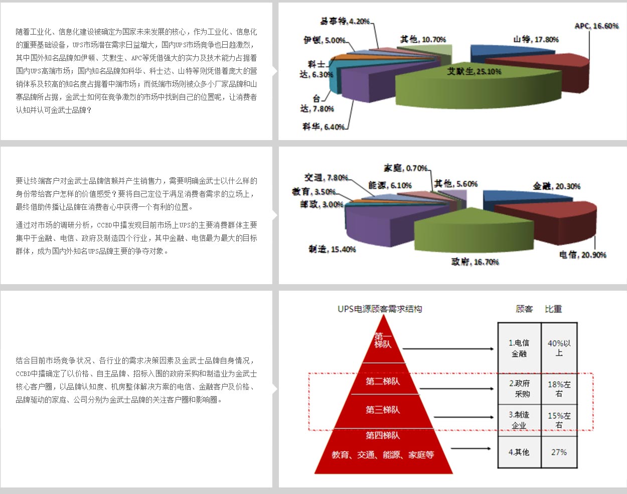 由此CCBD中擂對政府、行業(yè)客戶及普通消費者等金武士目標及影響消費群進行深入調(diào)研。通過研究發(fā)現(xiàn)安全、可靠、實效、解決問題是目標消費者所最為關(guān)注的需求點。對于客戶來說,他們要的不僅僅UPS產(chǎn)品,而是一個完整的電力保護解決方案 。