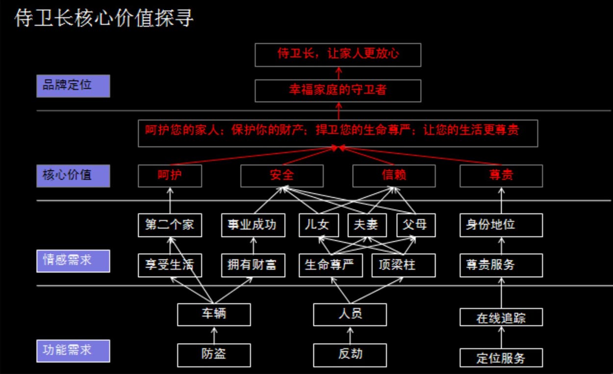 侍衛(wèi)長的主要消費人群是25~40歲的中產(chǎn)人群。在他們關(guān)注的幾個關(guān)鍵詞分別是家人、安全、品位、生活、親情、事業(yè)。侍衛(wèi)長具備著安全、呵護、信賴、尊貴等個性,實時在線的GPS防盜反劫服務(wù)能滿足他們對家人財產(chǎn)安全的基本理性需求。侍衛(wèi)長的守護,能讓家人安心,不必擔心出現(xiàn)各種人身或財產(chǎn)的損失。從深層次滿足消費者的感性需求。