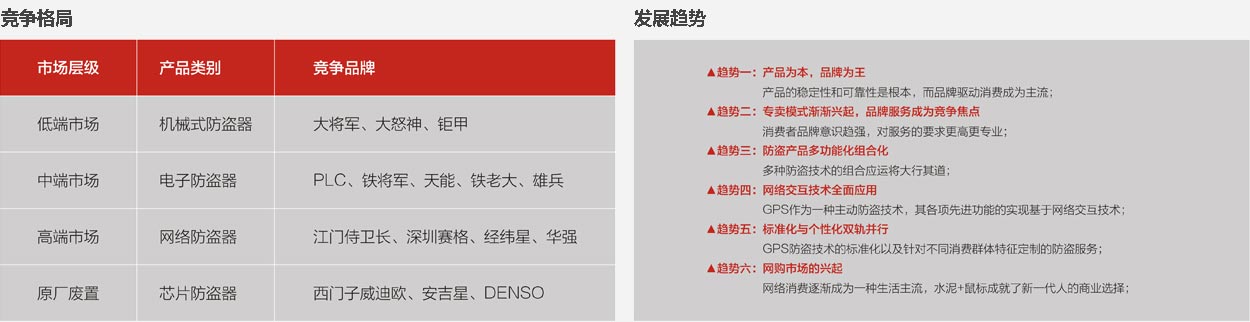 在汽車后裝市場,目前國內(nèi)汽車防盜器市場品牌林立,群雄割據(jù),但大多都處于產(chǎn)品同質(zhì)化的中低端傳統(tǒng)電子防盜領(lǐng)域,在中高端的GPS網(wǎng)絡(luò)防盜領(lǐng)域,目前的競爭品牌不多,尚沒有形成領(lǐng)導性的強勢品牌。而在前裝市場,各個派系車型基本上都擁有自己嫡系的防盜器原供品牌,中國本土品牌進入的壁壘較高。