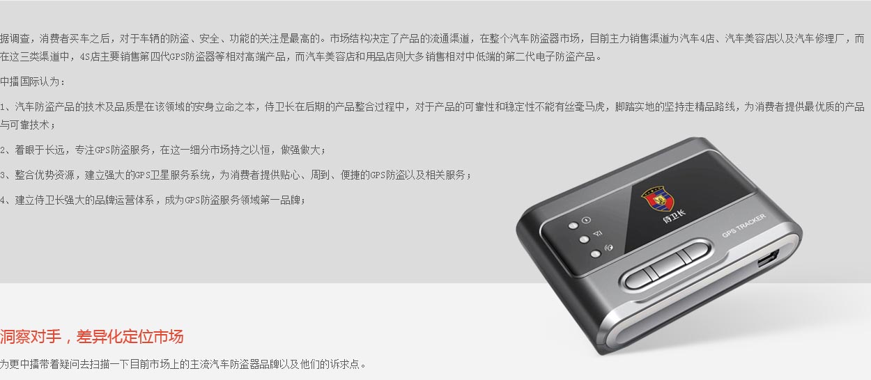 中擂結(jié)合競爭對手狀況及企業(yè)自身資源,以GPS防盜行業(yè)特征+產(chǎn)品物理屬性+消費者心智研究為核心研究內(nèi)容,尋找獨特的品牌機會點,差異化的品牌定位策略,塑造特色化的品牌形象,對侍衛(wèi)長進行品牌精準定位的定位策略。