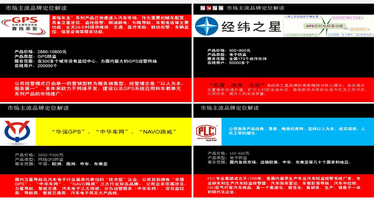 汽車防盜器后裝市場,目前能和侍衛(wèi)長形成競爭關(guān)系的品牌不多。根據(jù)分析,目前在GPS服務(wù)領(lǐng)域做的比較好的品牌主要有深圳賽格、深圳華強、北斗大三通等,但這些企業(yè)的成功大多來源于早期的地緣經(jīng)濟或者政治,其在品牌核心理念及定位上都普遍模糊,尤其在對于市場消費者的定位上基本上采用了一網(wǎng)打盡的策略;