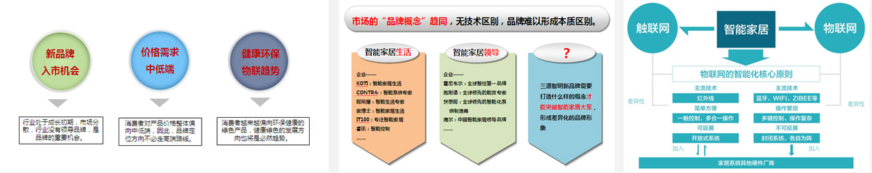 通過對三源智明企業(yè)自身及產(chǎn)品優(yōu)勢的詳細(xì)調(diào)研分析,我們發(fā)現(xiàn)三源智明品牌具有可擴(kuò)展的生態(tài)系統(tǒng)平臺、一體化整合智能家居系統(tǒng)、自主研發(fā)一觸控制技術(shù)三大核心技術(shù)優(yōu)勢,相對于智能家居的大眾技術(shù)平臺,三大核心技術(shù)優(yōu)勢為品牌差異化定位提供了絕對優(yōu)勢保證。