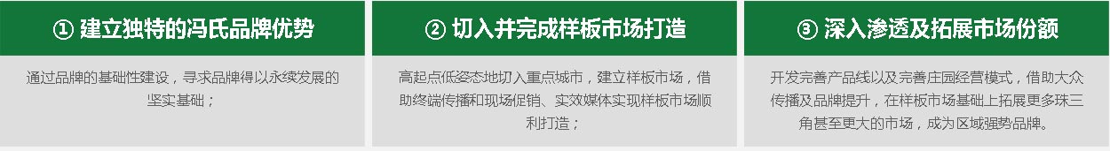 在整個(gè)社會(huì)關(guān)注食品安全問題的環(huán)境下,馮氏品牌的推出是對(duì)食品安全的一種隱性承諾。中擂建議馮氏結(jié)合企業(yè)產(chǎn)品,深度剖析珠三角農(nóng)產(chǎn)品市場(chǎng),以自營(yíng)專賣+特許連鎖+超市專柜的模式,切入珠三角各大農(nóng)產(chǎn)品終端,進(jìn)行市場(chǎng)擴(kuò)張。