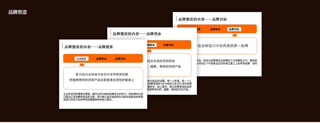 通過上面的分析,中擂基本上確定了富臨美達即將要走的方向——搶占全球進口冷凍肉連鎖第一品牌的位置,以純進口、原生態(tài)、口感好為產(chǎn)品概念,以社區(qū)廚房、貼心服務為品牌概念,以全球進口生態(tài)冷凍肉類產(chǎn)品第一品牌為品牌發(fā)展方向。致力成為全球進口生態(tài)冷凍肉類供應商,把健康美味的肉類產(chǎn)品送到普通老百姓的餐桌上。