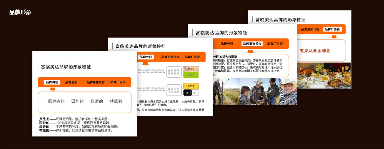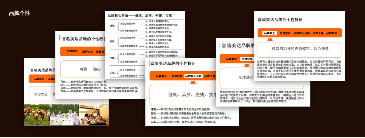 中擂認為,富臨美達用100%純進口的概念能有效區(qū)分國內(nèi)所有的大品牌。通過走進社區(qū),用社區(qū)連鎖的服務阻隔國外進口肉類的大品牌,同時充分利用國內(nèi)消費者對于消費國外進口產(chǎn)品在身份、地位以及面子等方面的心理特征。從產(chǎn)品本身、渠道服務優(yōu)勢以及消費者消費特征三個方面,構(gòu)筑富臨美達獨特的品牌定位。又從品牌調(diào)性、色彩等方面塑造起富臨美達獨一無二的品牌形象。