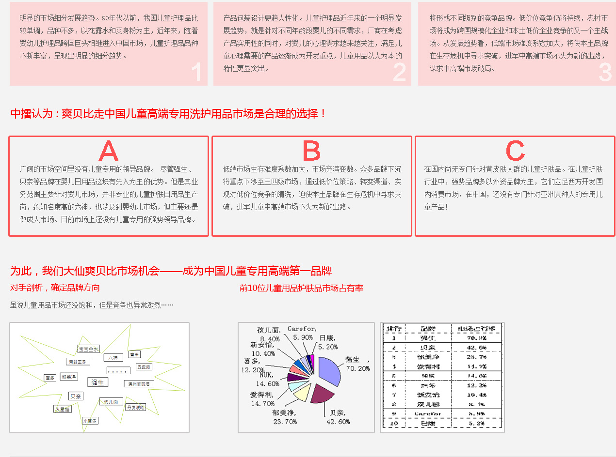 兒童用品領(lǐng)域聚集了強生、貝親等強勢品牌,低價位同質(zhì)化競爭異常激烈!一些品牌欲放棄嬰兒市場專攻兒童市場,不過目前市場上還沒有兒童專用的強勢領(lǐng)導品牌。各大兒童品牌賣點都集中在“呵護,關(guān)愛孩子”上作文章,大打親情牌,從情感上感染具有購買決策者無疑是一種成功的模式,不過,缺少的是創(chuàng)新與突破。“自然可靠”極具號召力,但是缺乏強勢植物草本品牌。眾兒童品牌都意識到了植物的號召力,但產(chǎn)品又多是化工合成產(chǎn)品,對“天然、綠色”的品牌形象有所回避只是在產(chǎn)品或產(chǎn)品系列上有所關(guān)聯(lián),缺乏田七草本、佰草集這樣的草本品牌。