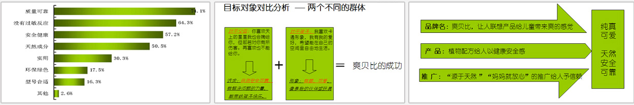 目標人群描述:22-40歲,她(他)們是孩子的家長(尤其是母親),她們對于她們來說,有可支配的經(jīng)濟能力, 價格不是問題,產(chǎn)品質(zhì)量才最重要,她們在購買更注重品牌知名度高低和產(chǎn)品質(zhì)量的優(yōu)越性上。在各種“問題門”事件的影響下,選擇兒童產(chǎn)品更是慎之又慎。