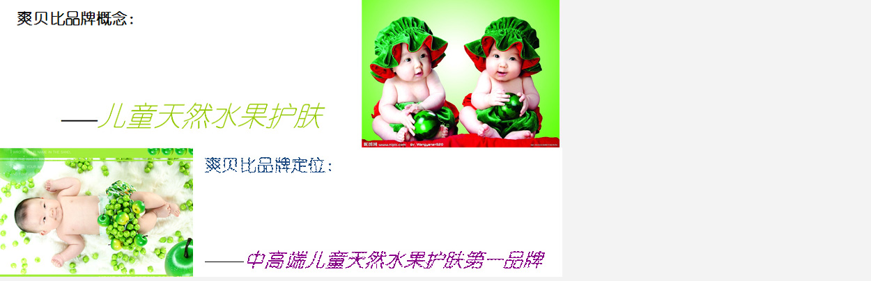 爽貝比以水果為主要原材料,提取水果素,水果精華,水果活性因子,用來兒童護膚,天然、健康、環(huán)保、安全,是一個好產(chǎn)品的重要體現(xiàn)!借水果部落故事片,以角色營銷為切入口,樹立水果護膚新理念。創(chuàng)造一個水果護膚部落,塑造一系列水果寶貝,形成一系列水果護膚故事。全面貫徹天然水果護膚理念。