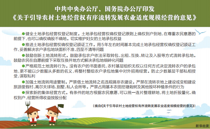 11月20日,《關(guān)于引導(dǎo)農(nóng)村土地經(jīng)營權(quán)有序流轉(zhuǎn)發(fā)展農(nóng)業(yè)適度規(guī)模經(jīng)營的意見》公布。推動土地流轉(zhuǎn)、發(fā)展規(guī)模經(jīng)營對當(dāng)前我國農(nóng)業(yè)生產(chǎn)有何意義?在推進過程中,農(nóng)民的權(quán)益怎么保證?如何避免工商資本進入農(nóng)村后造成“非糧化”“非農(nóng)化”,影響國家糧食安全?