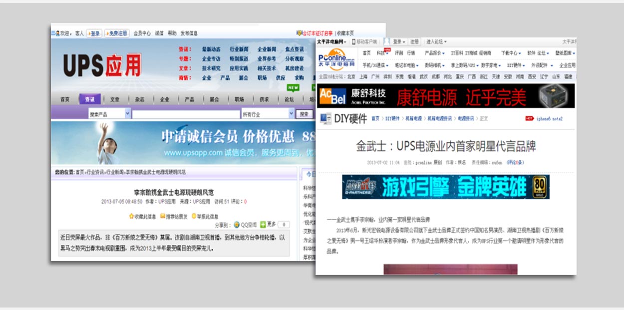 在CCBD中擂的協(xié)助下,2013年6月21日,新光宏銳電源設(shè)備有限公司金武士品牌正式簽約中國知名男演員、湖南衛(wèi)視熱播劇《百萬新娘之愛無悔》男一號王紹華扮演者李宗翰先生作為金武士品牌形象代言人,成為UPS行業(yè)第一個邀請明星作為形象代言的品牌。通過系列的宣傳推廣,極大地提升了金武士品牌的市場知名度與美譽度。